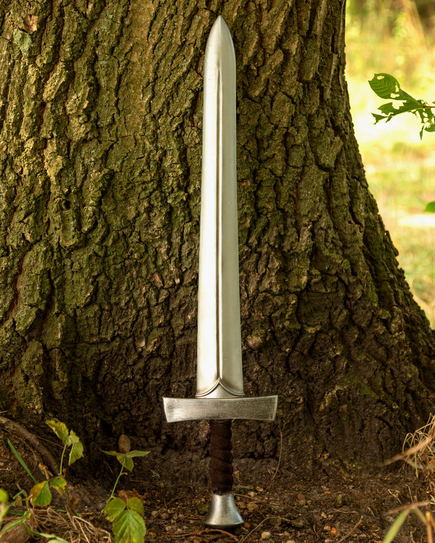 Kurzes Einsteiger Polsterschwert für Larp mit Parier und Wildledergriff. Mit Schaumstoff ummantelter flexibler Kernstab aus GFK.