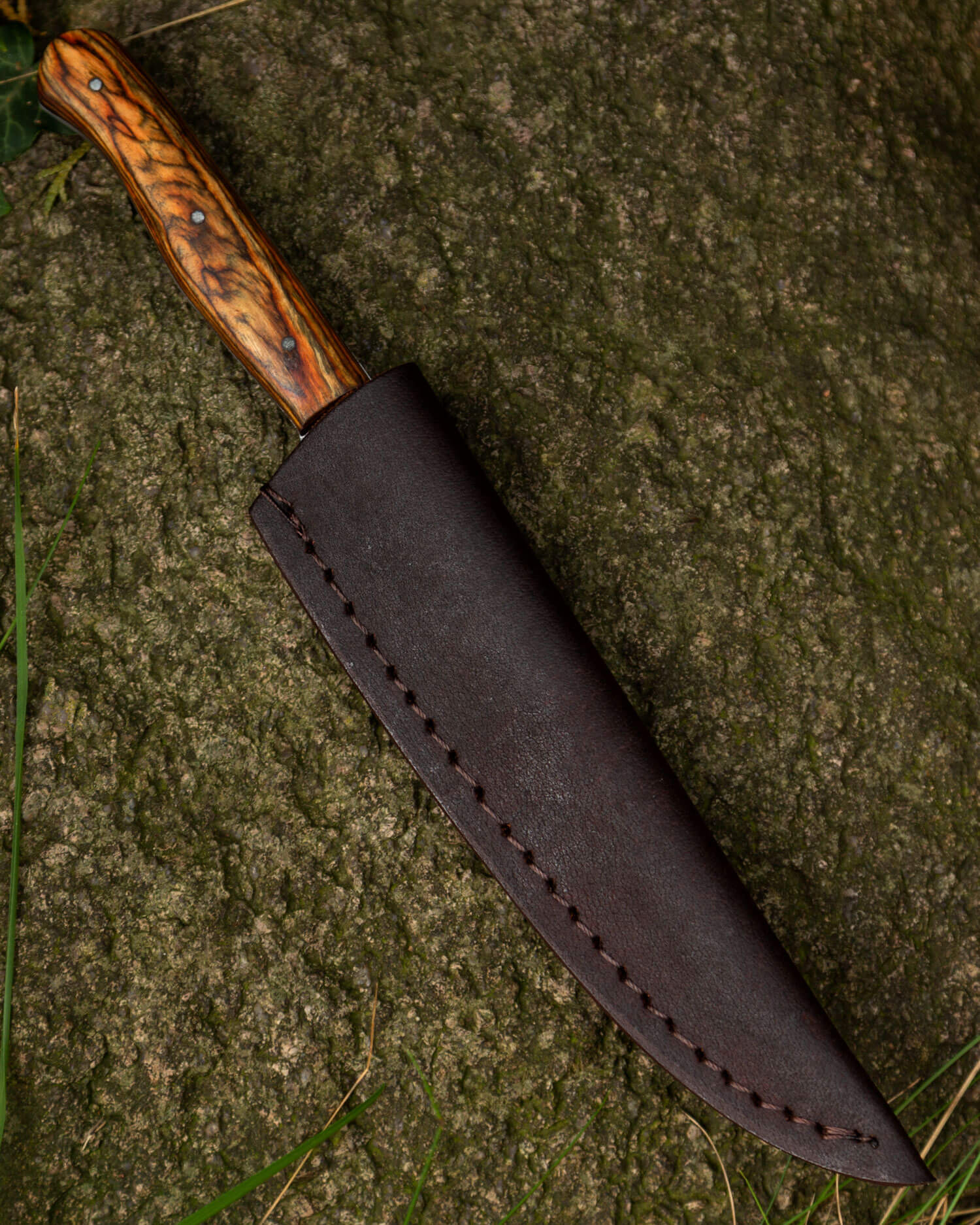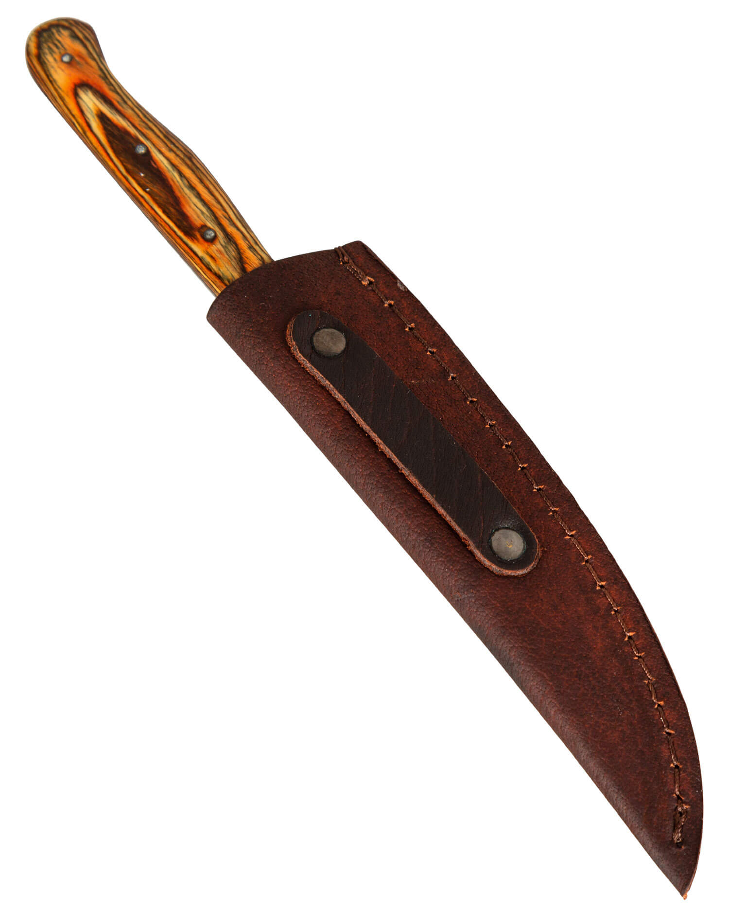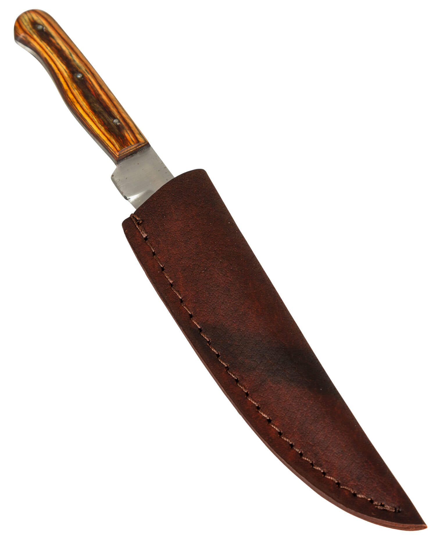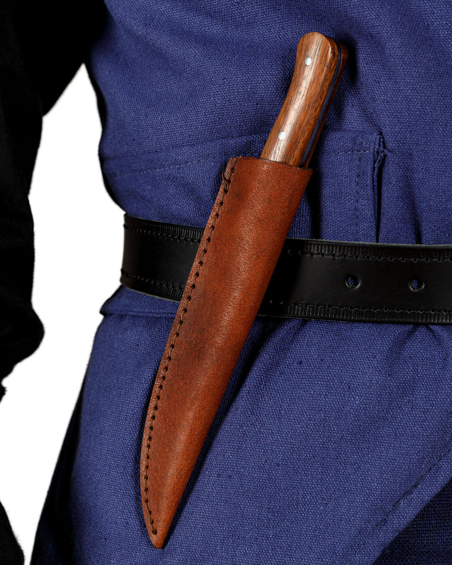 Mittelalterliches Messer mit passender Lederscheide und poliertem Holzgriff.