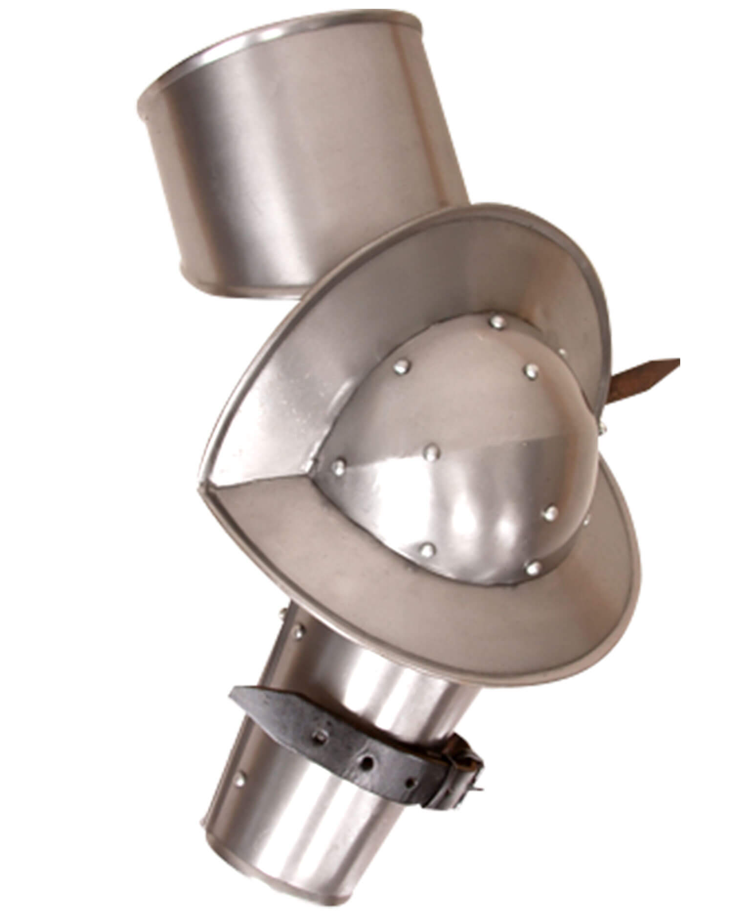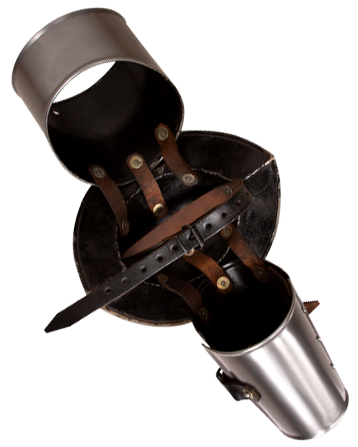 Einfacher Panzer aus Stahl für Armbeuge, Oberarm und Unterarm. Durch die Stahlösen am Oberarm kann der Ellbogenpanzer an Kettenhemd oder Gambeson montiert werden. Innen zum Rostschutz lackiert.