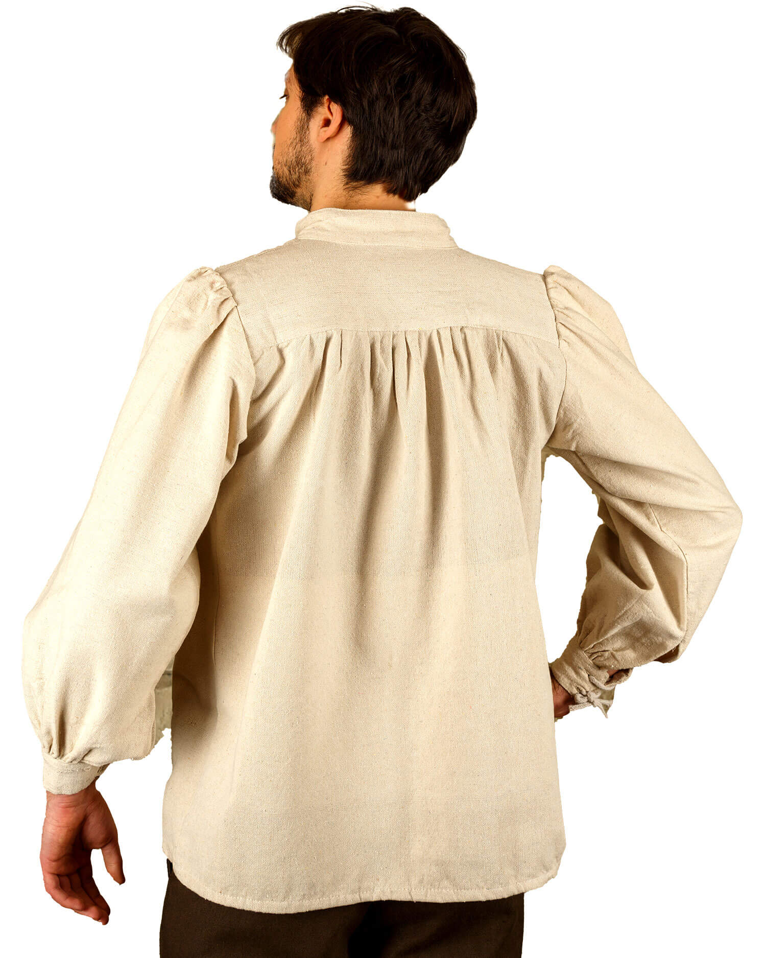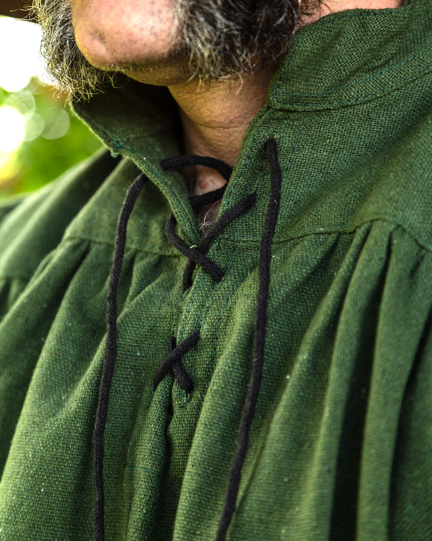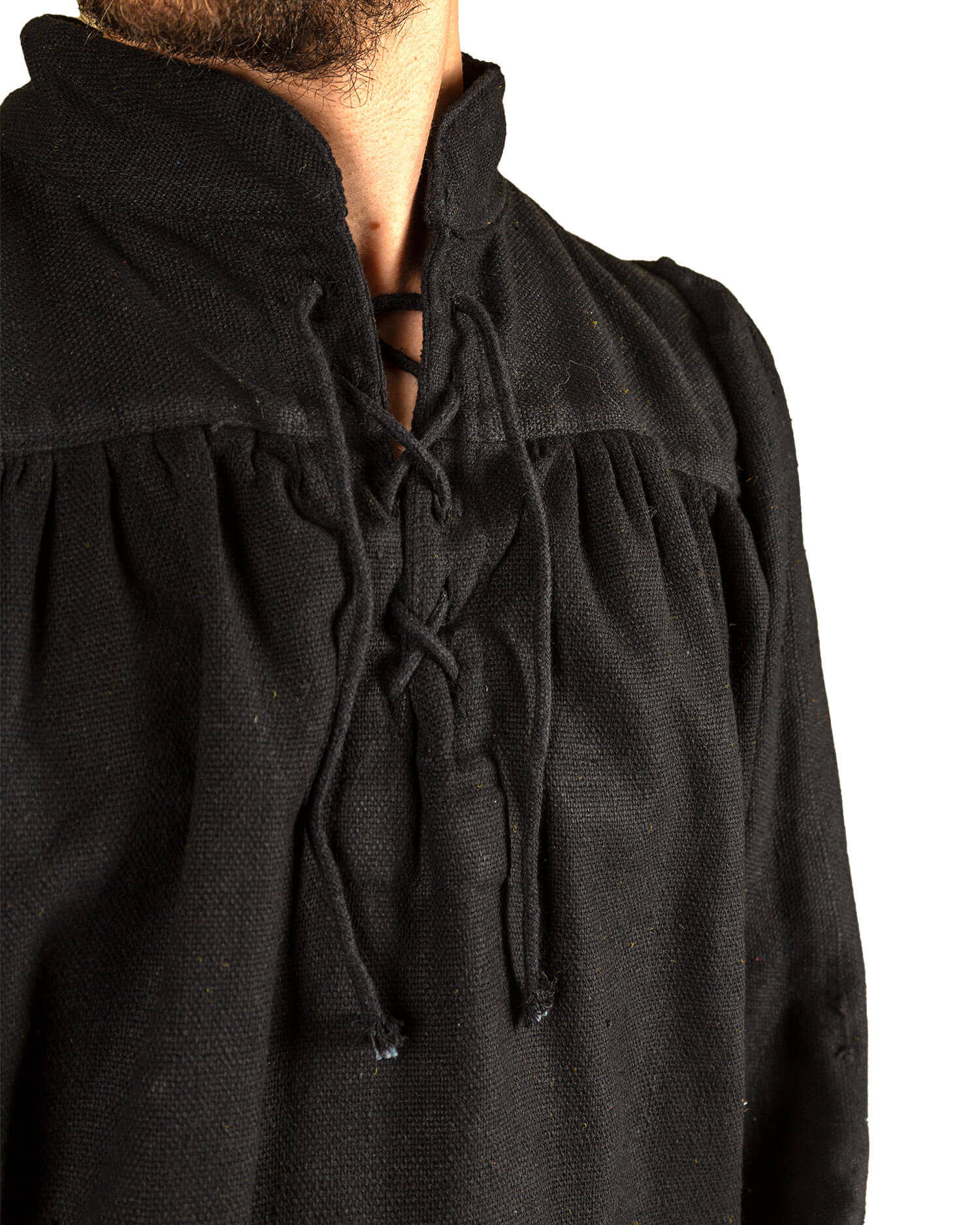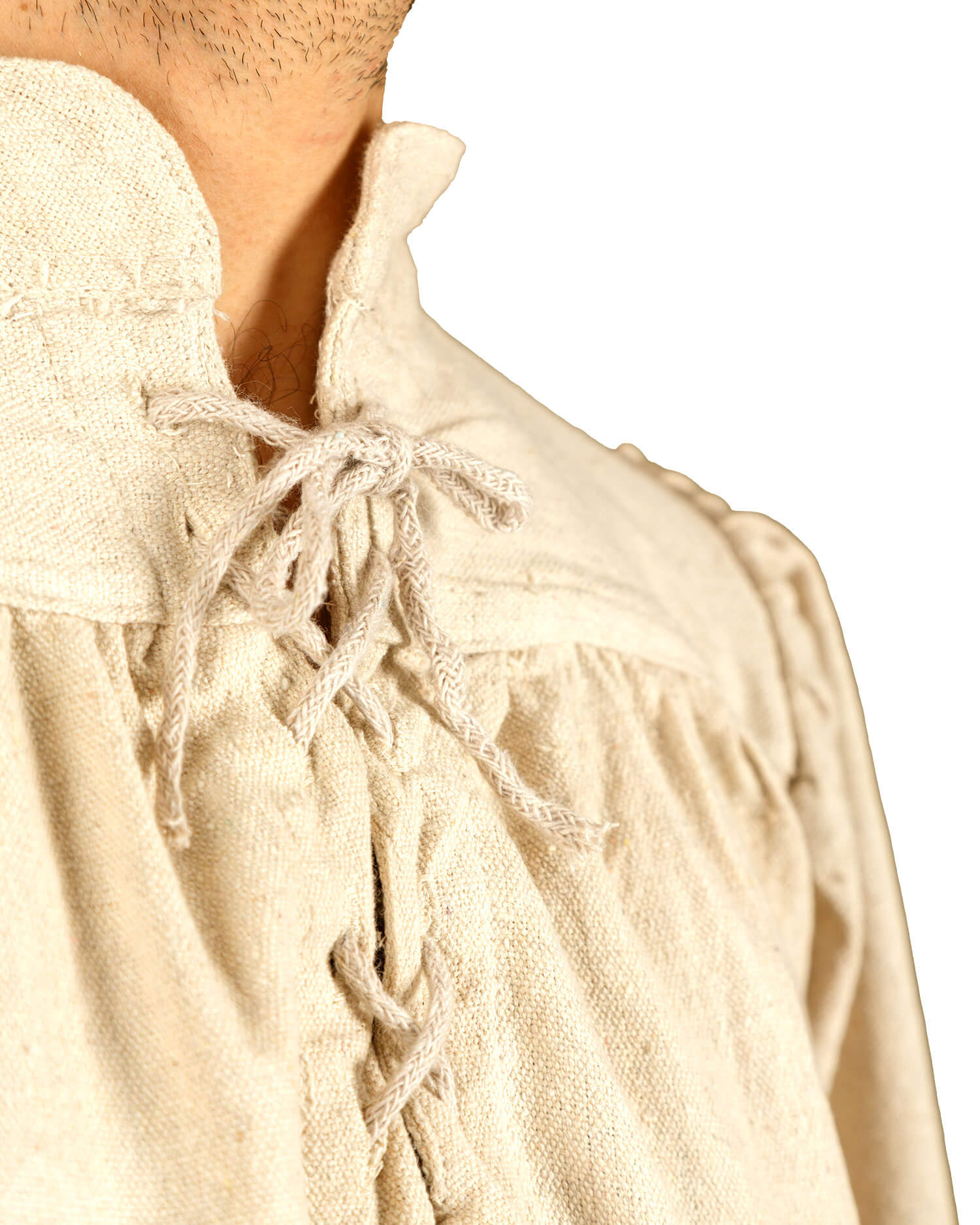 Mittelalterliches Baumwollhemd aus atmungsaktiver Baumwolle mit grober Oberfläche. Weit geschnitten, mit Schnürung an Ärmeln und Kragen.