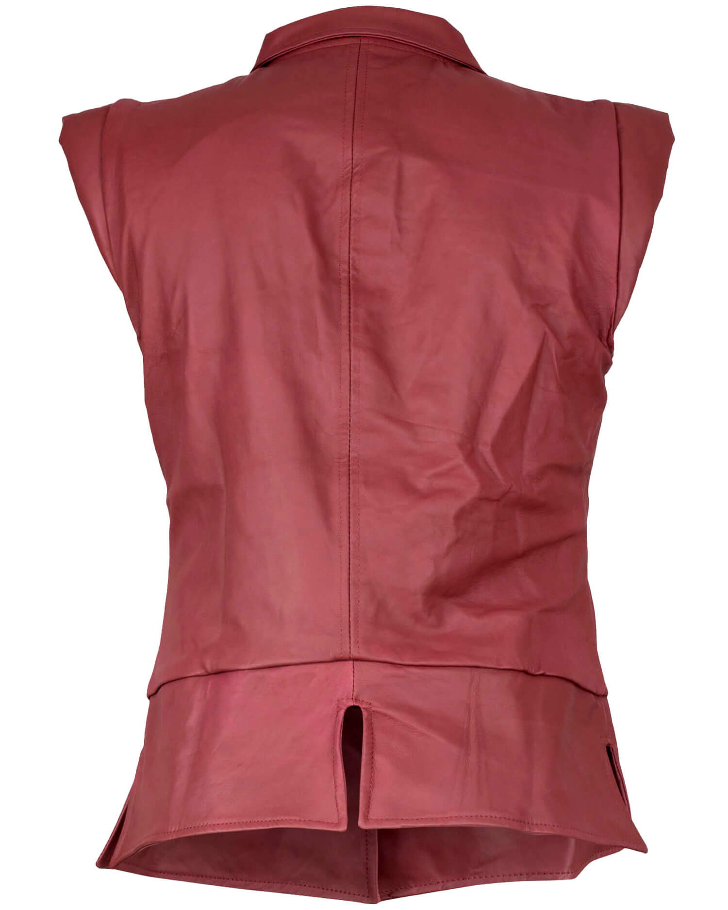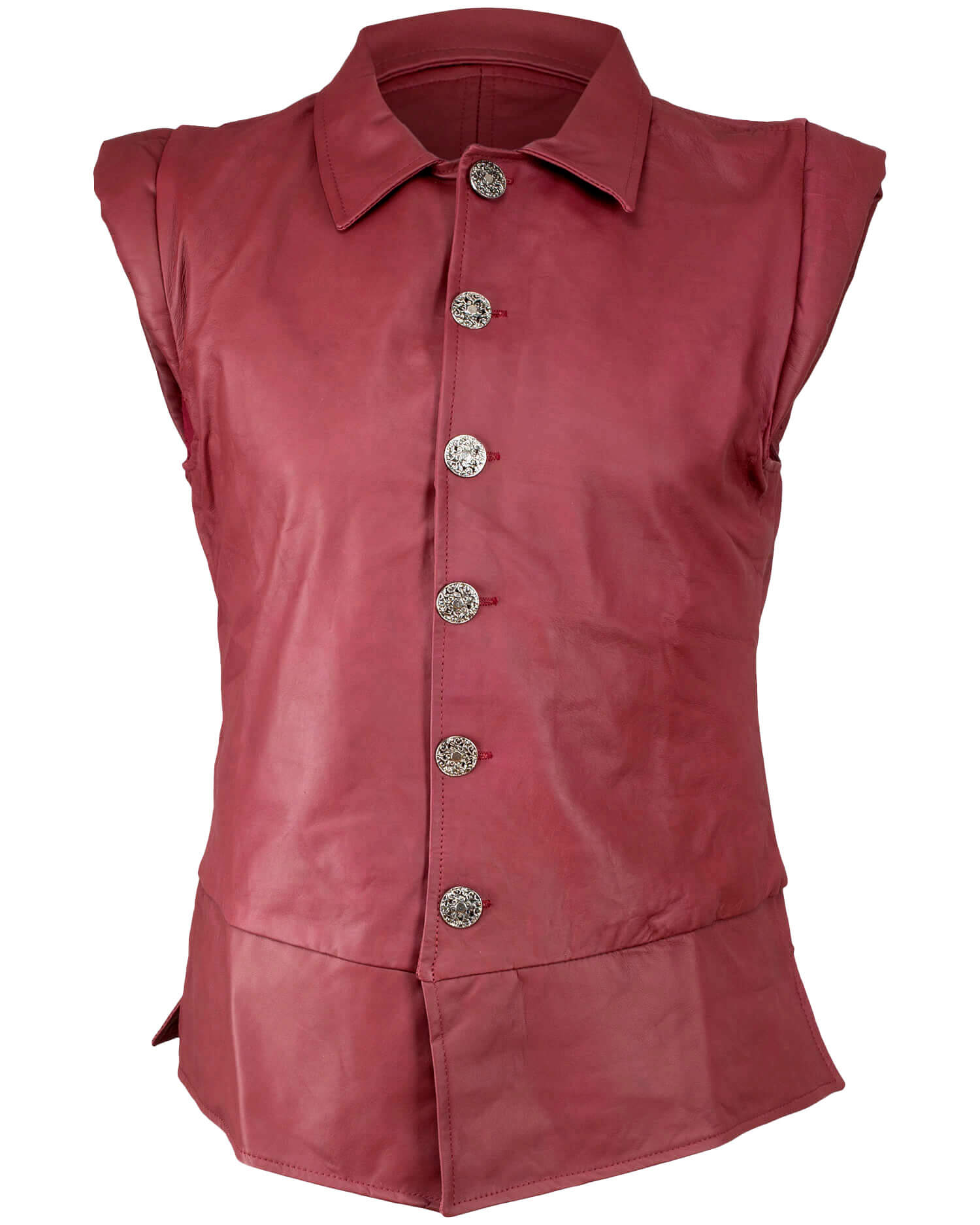 Lederwams mit Stehkragen und ausgestellten Schultern. Das Wams wird vorne mit Messingknöpfen geschlossen.