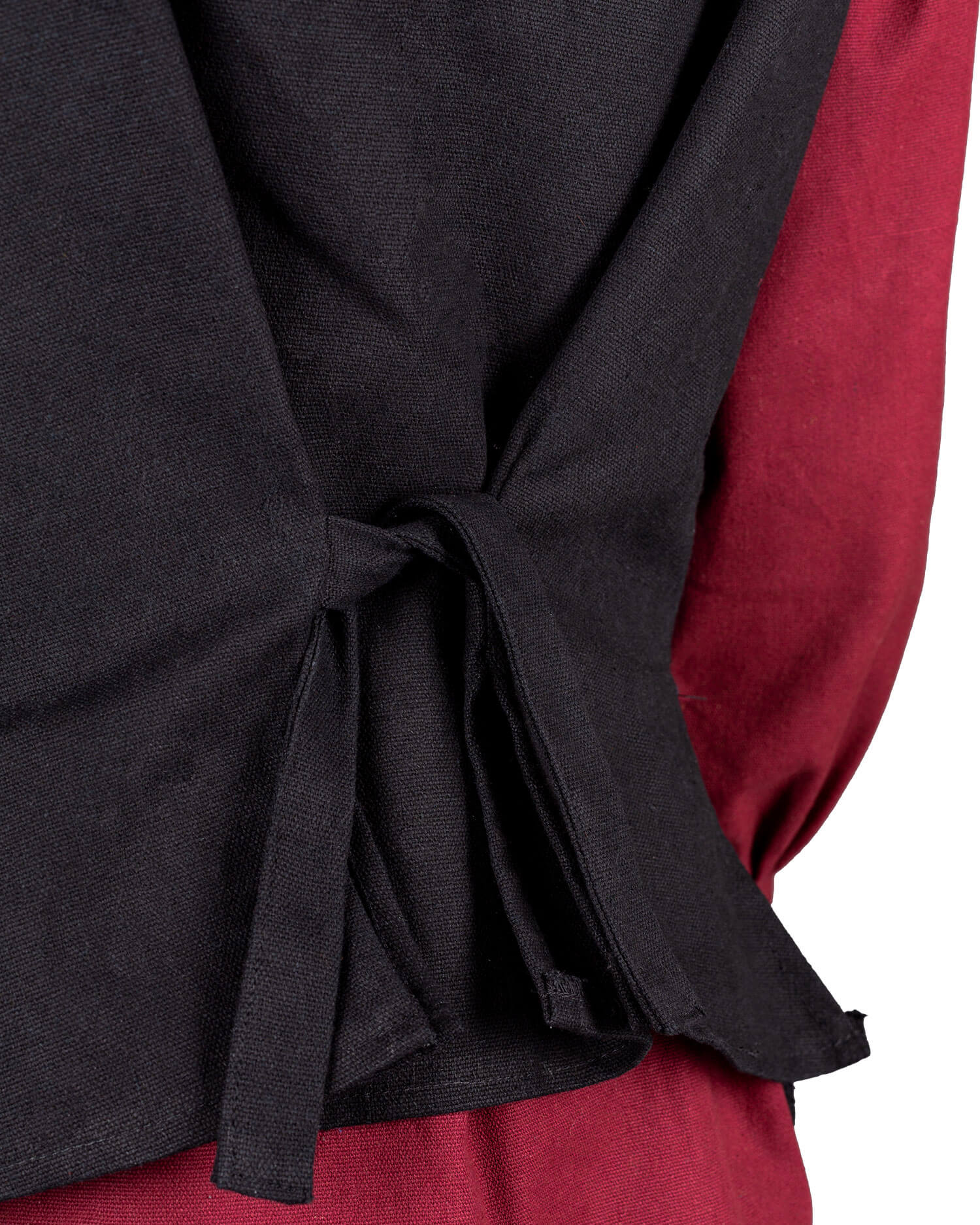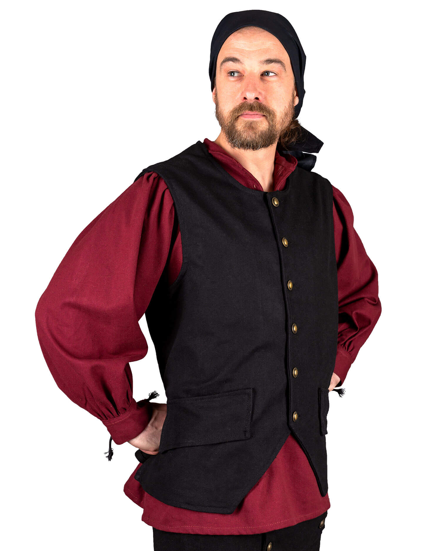 Mittelalterliche Weste im typischen Burda-Schnitt mit aufgesetzten Ziertaschen. In der Front mit Messingknöpfen geschlossen. Durch die Schnürung im Rücken kann sie einfach angepasst werden.