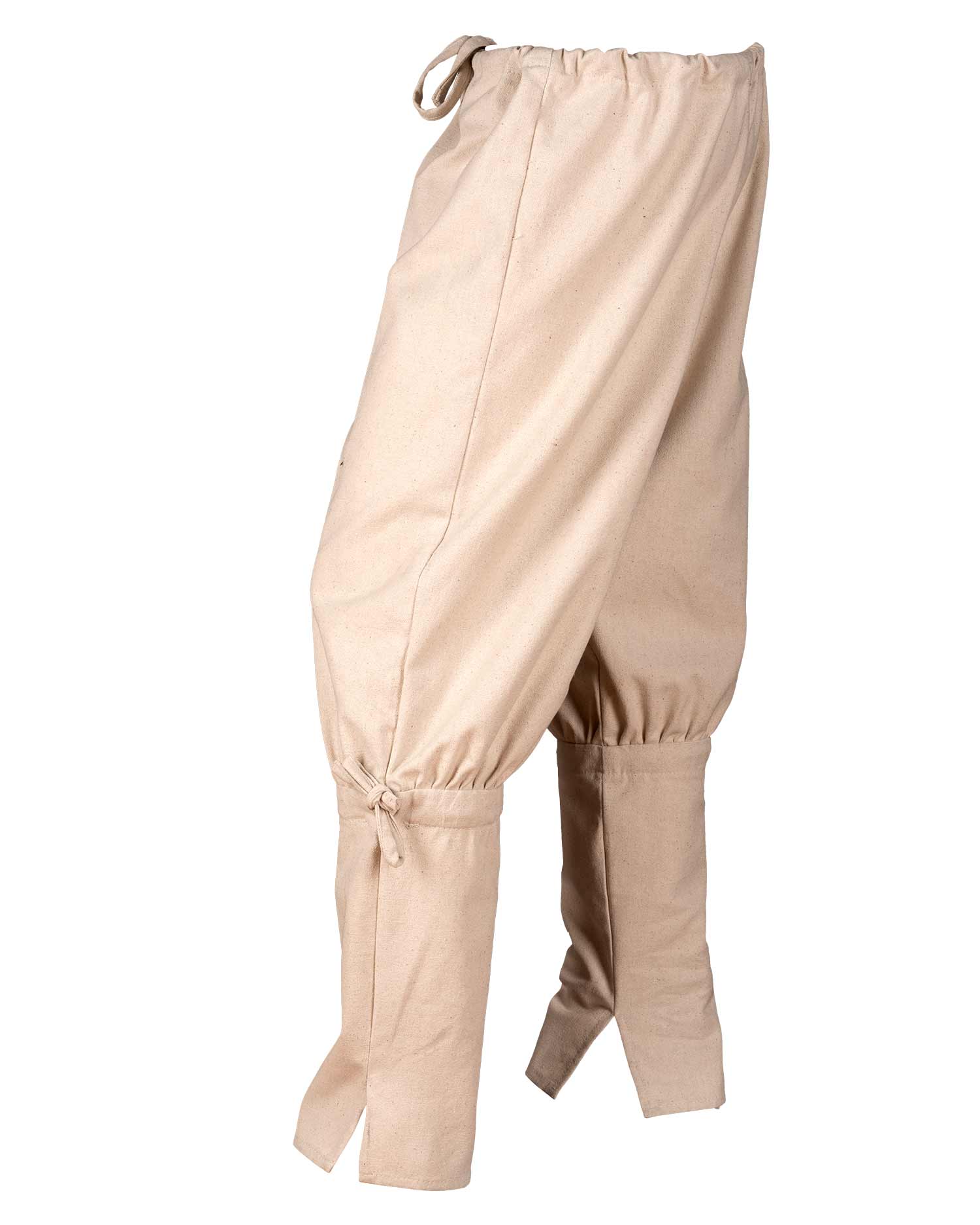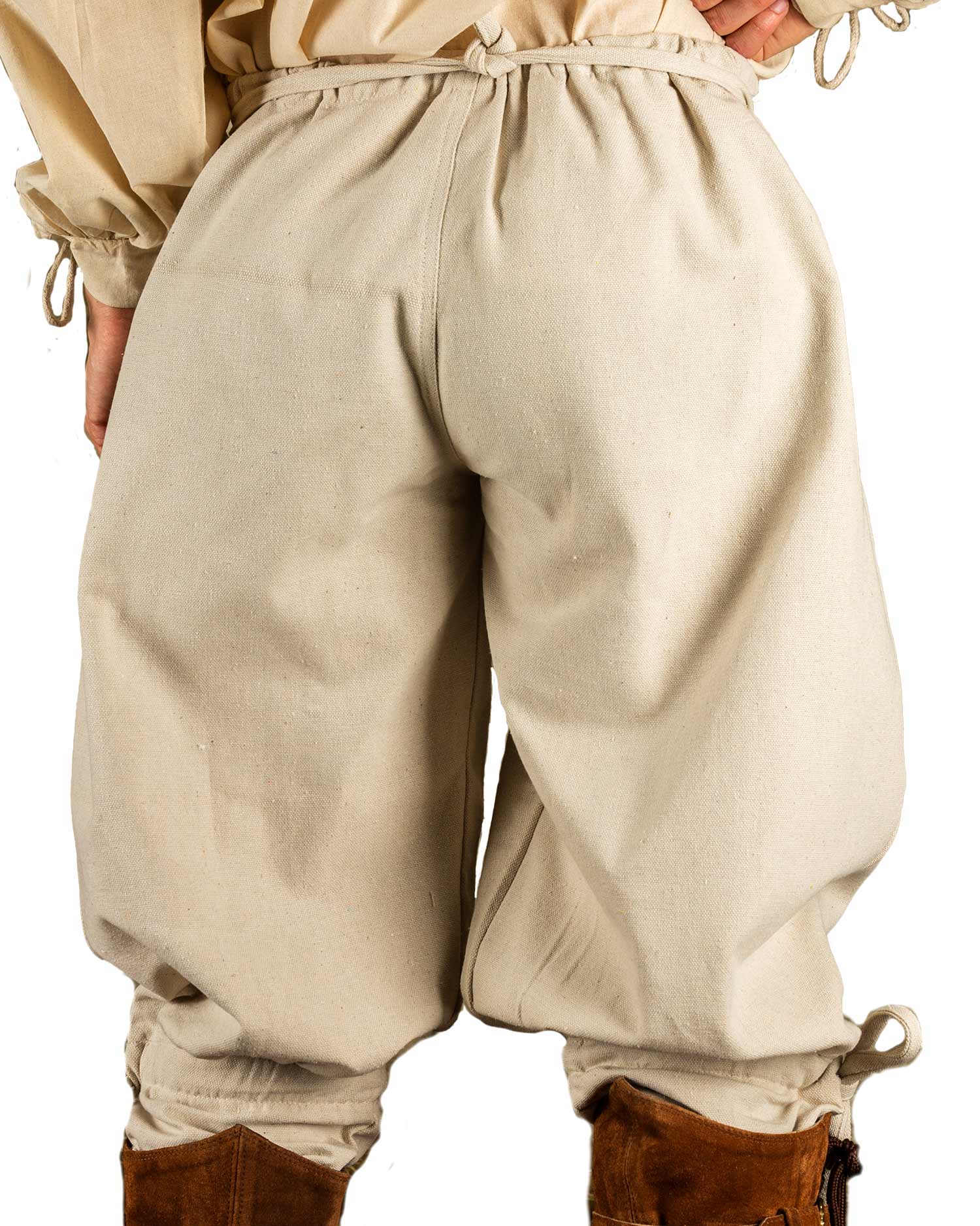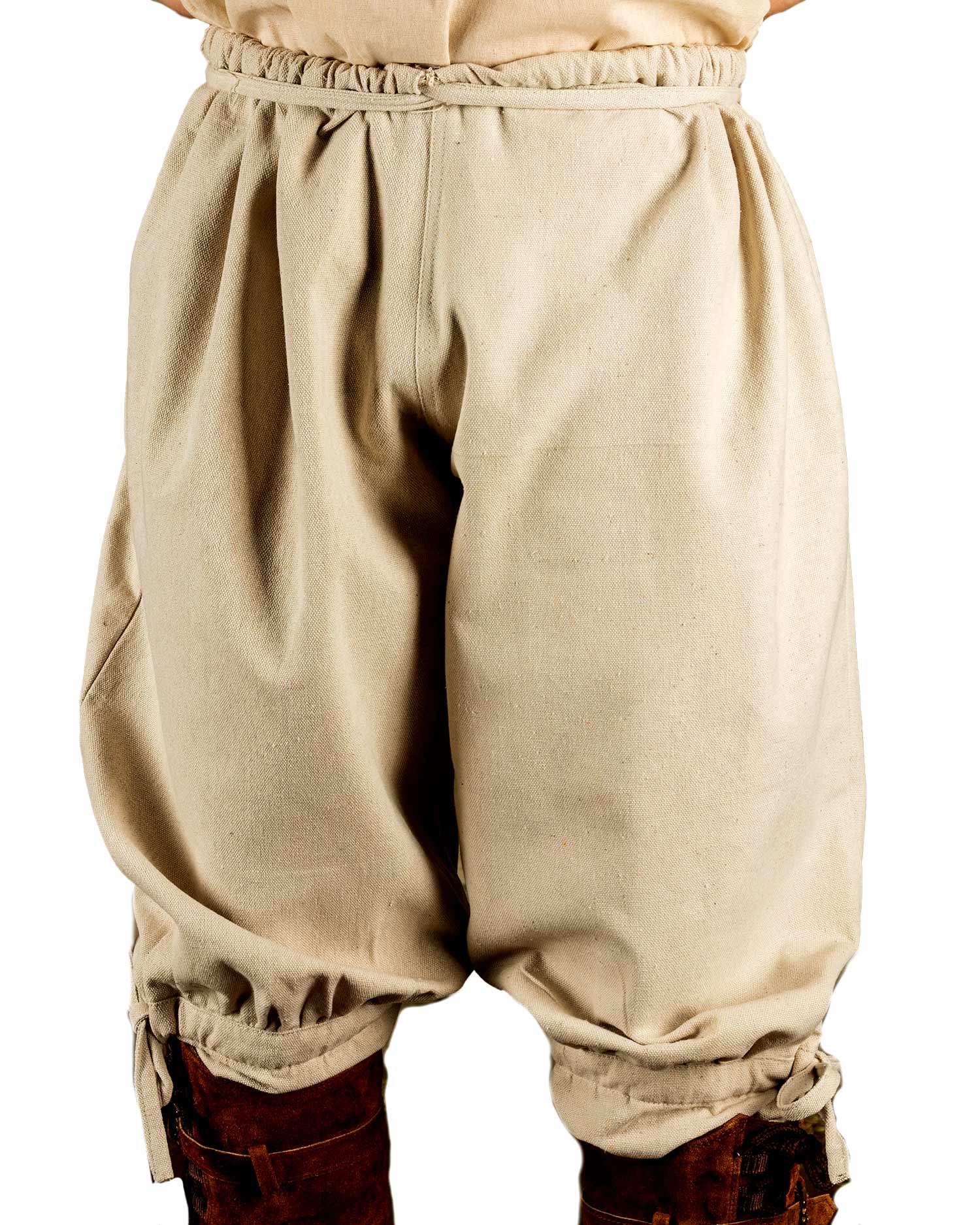 Wikinger Hose (sogenannte Rushose) mit besonders weitem Bund der mit Zugband gerafft wird. Ab dem Knie ist die Hose enger geschnitten und kann dadurch sehr gut mit Wadenwickeln oder Beinschienen kombiniert werden.