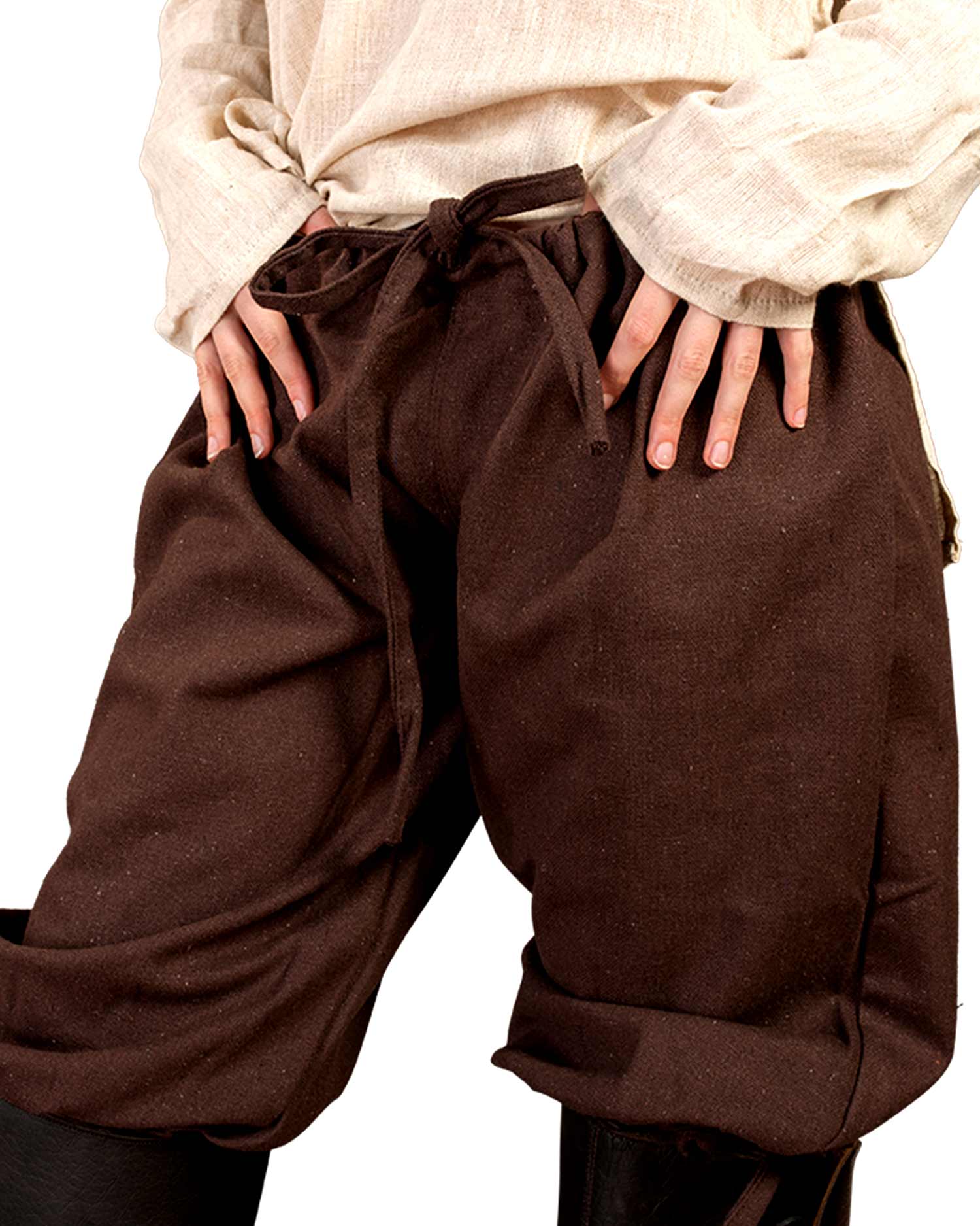 Wikinger Hose (sogenannte Rushose) mit besonders weitem Bund der mit Zugband gerafft wird. Ab dem Knie ist die Hose enger geschnitten und kann dadurch sehr gut mit Wadenwickeln oder Beinschienen kombiniert werden.