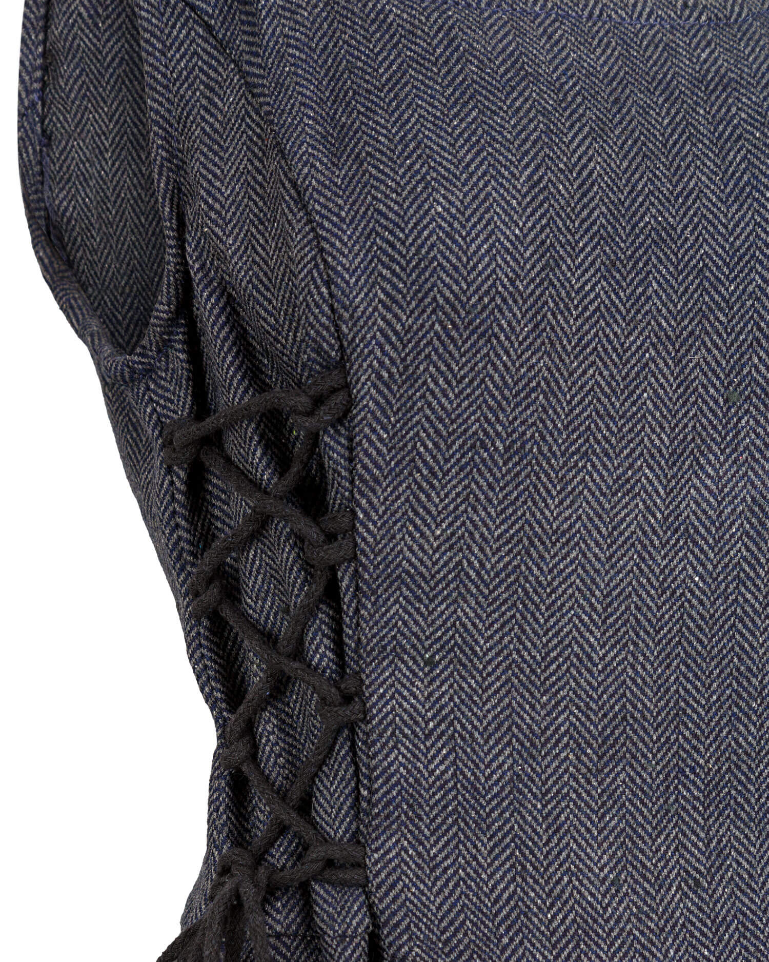 Ärmelloses Kleid aus edlem Fischgrat. Im Rücken mit einer Schnürung geschlossen und an den Seiten einstellbar.