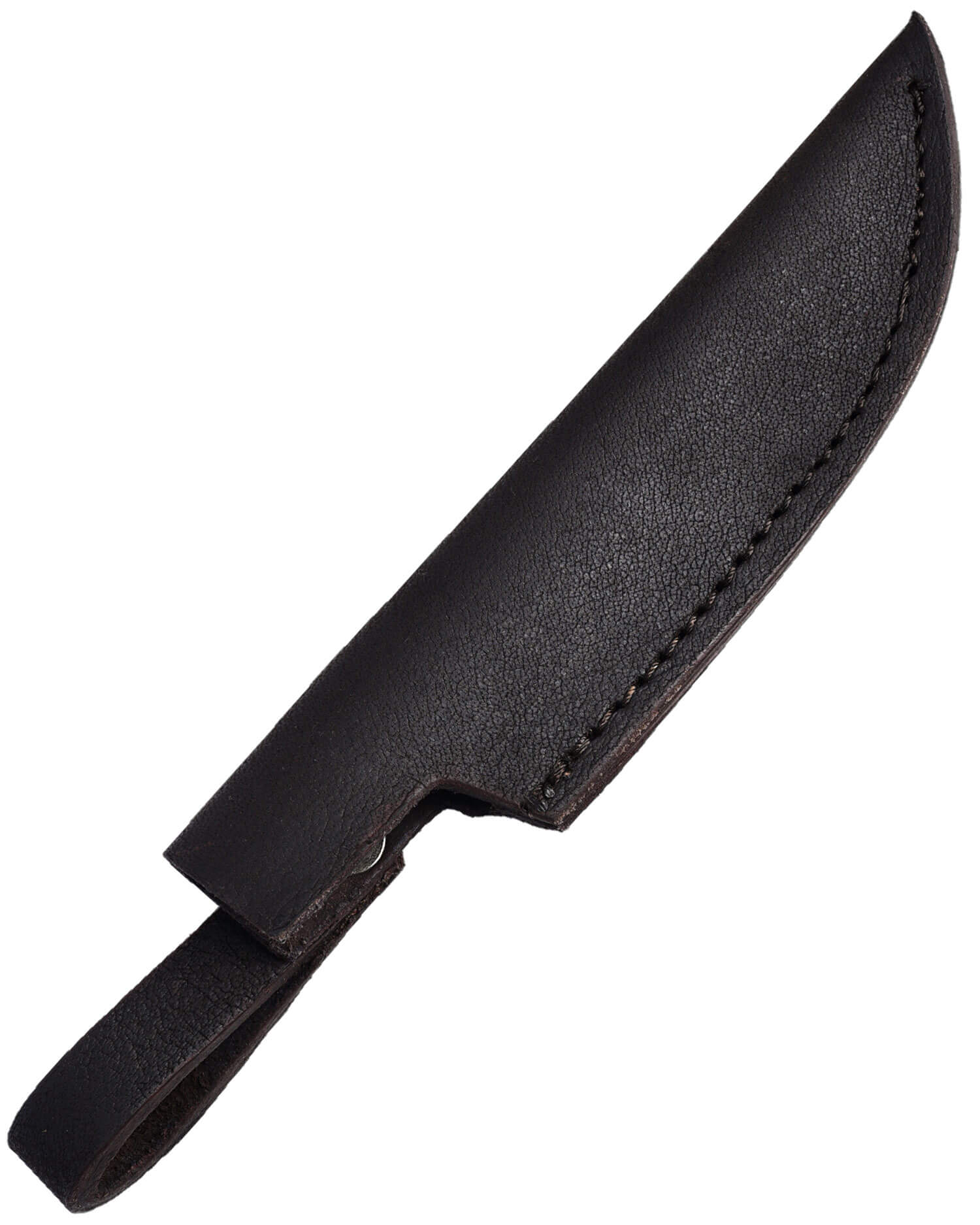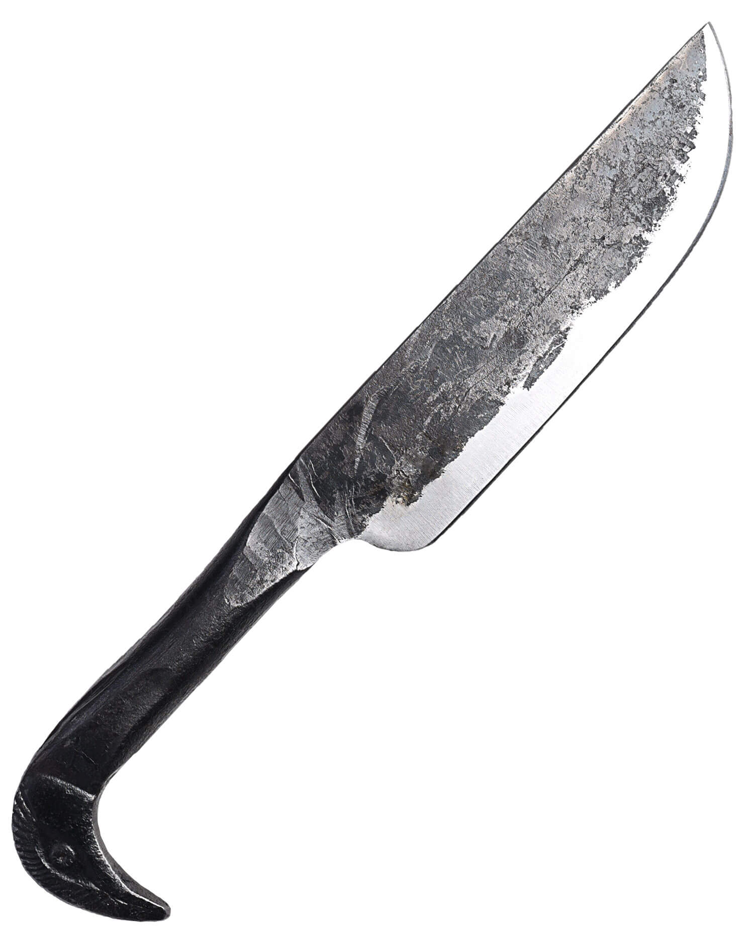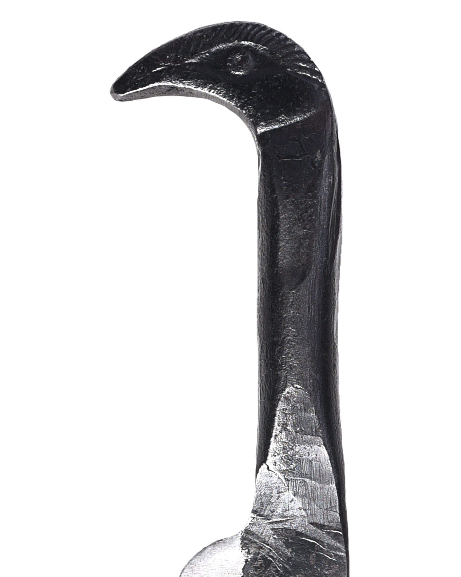 Grob geschmiedetes Messer mit stilisiertem Vogelkopf am Griff mit passender Lederscheide.