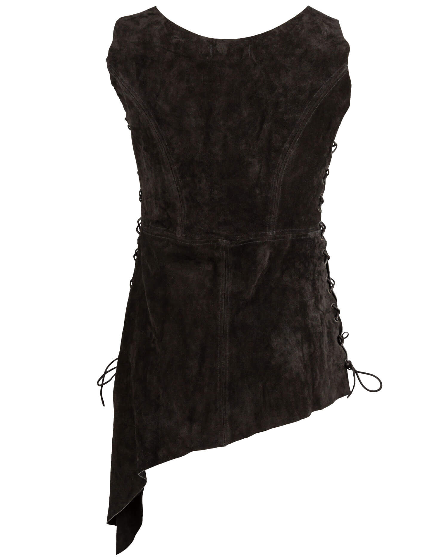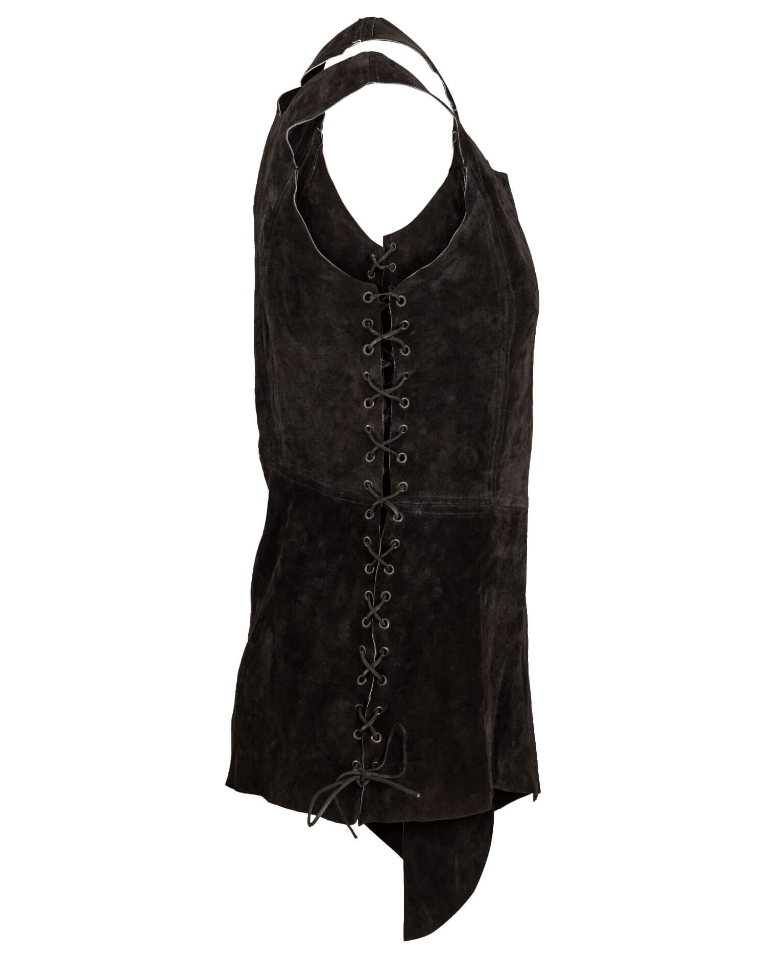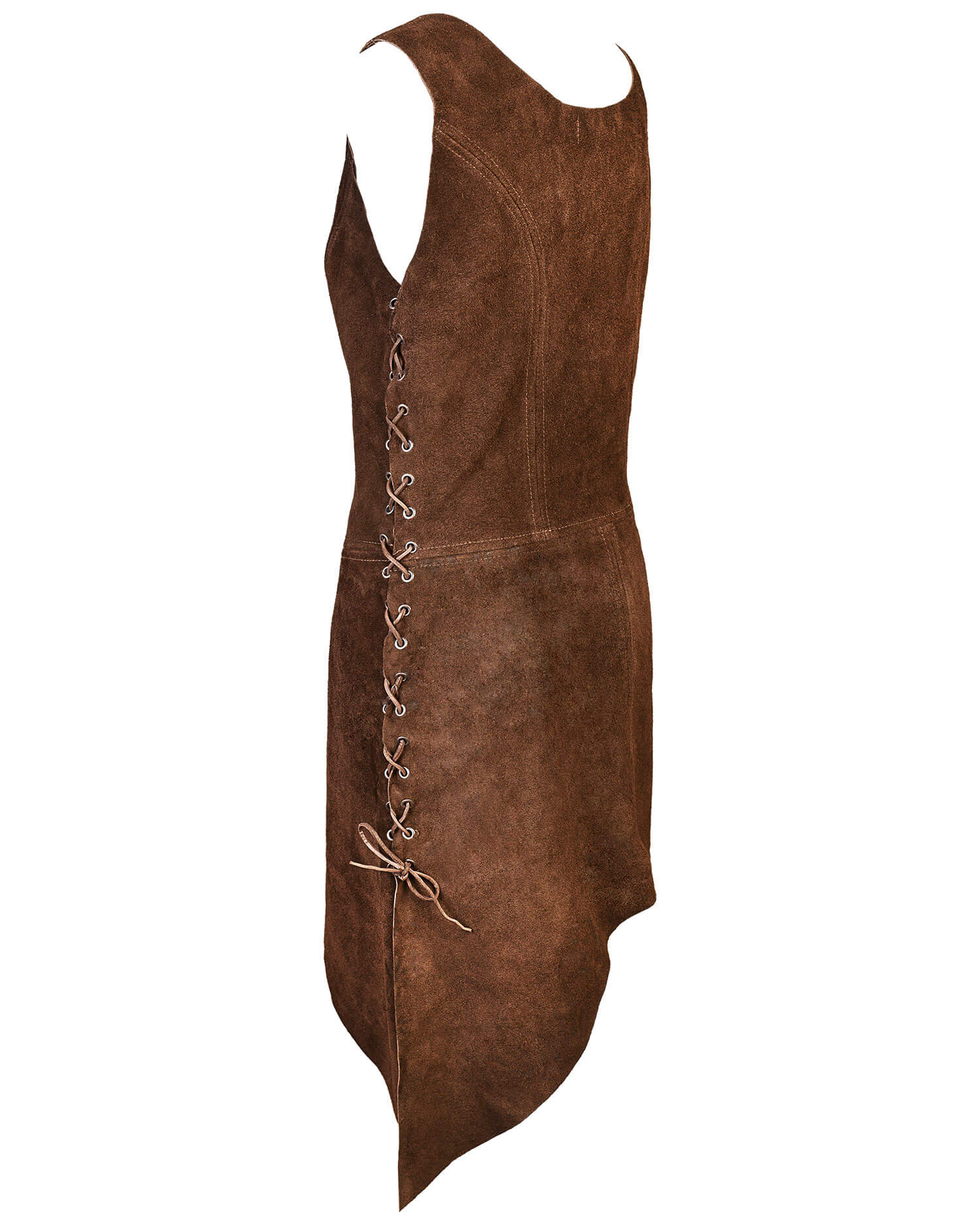 Bias-cut tabard made from fine suede. Closed at the sides with leather lacing.