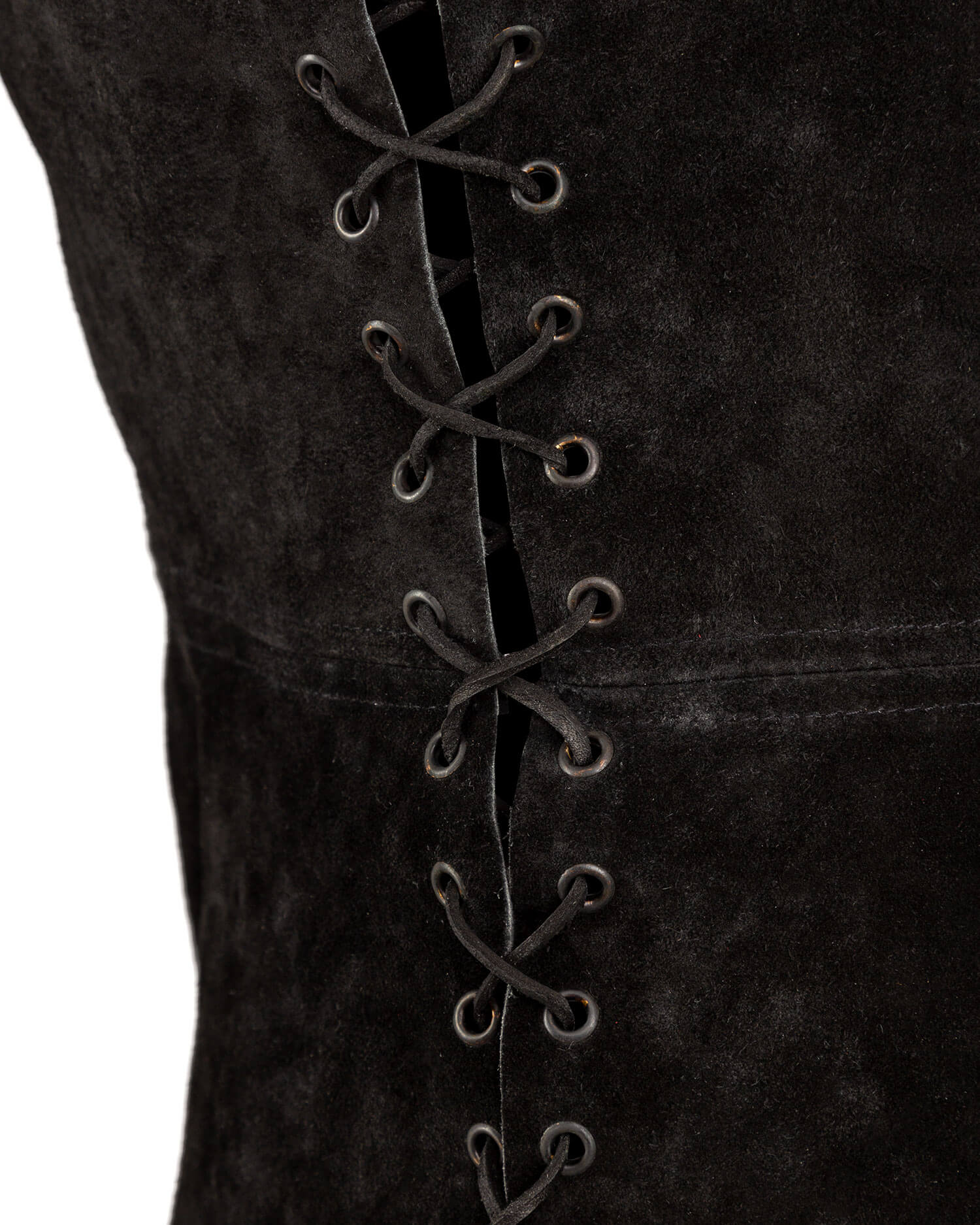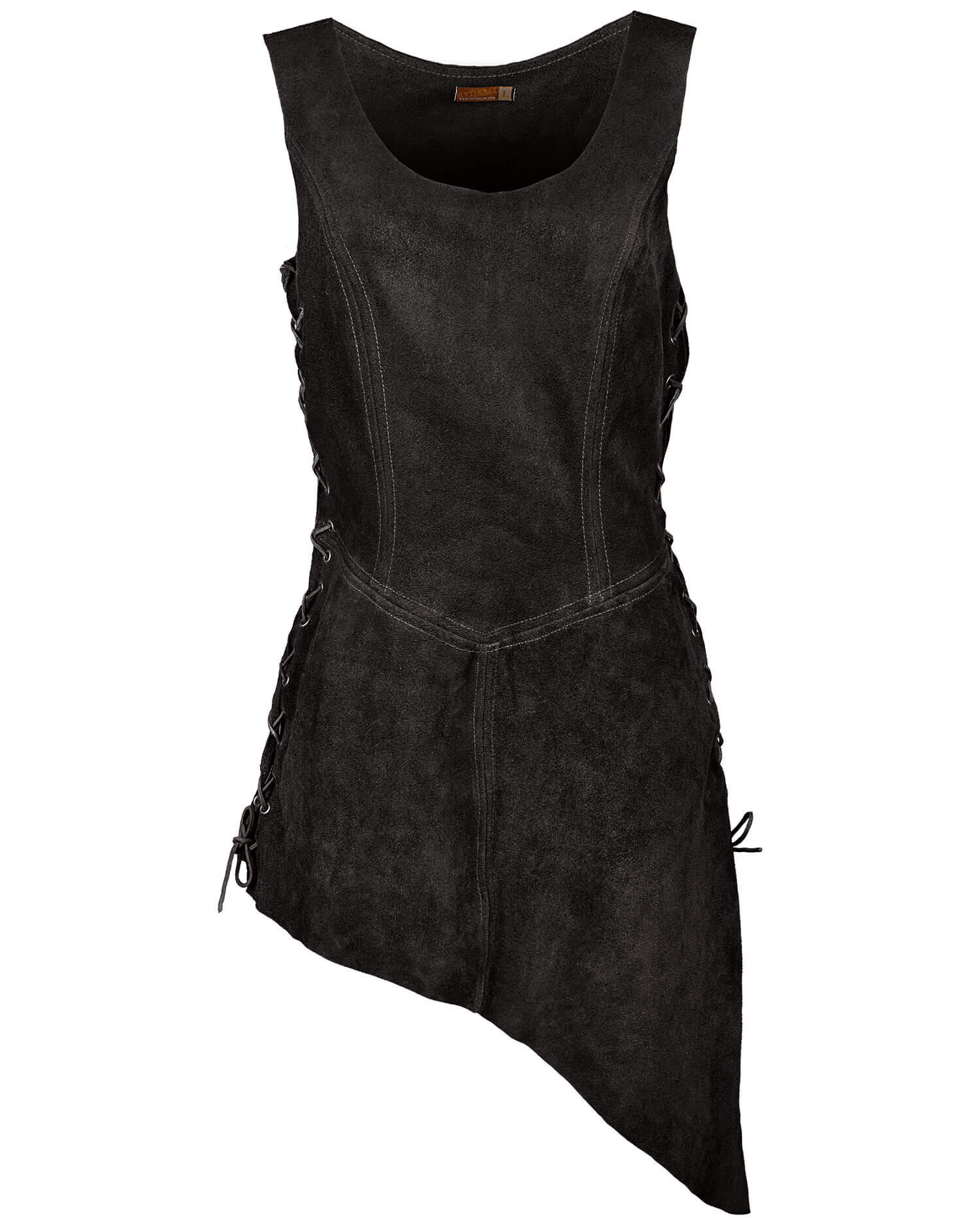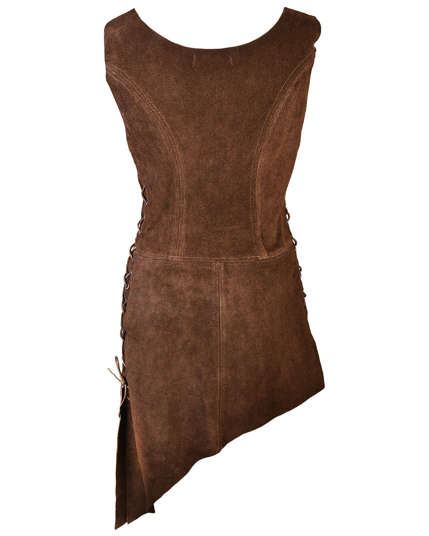 Bias-cut tabard made from fine suede. Closed at the sides with leather lacing.