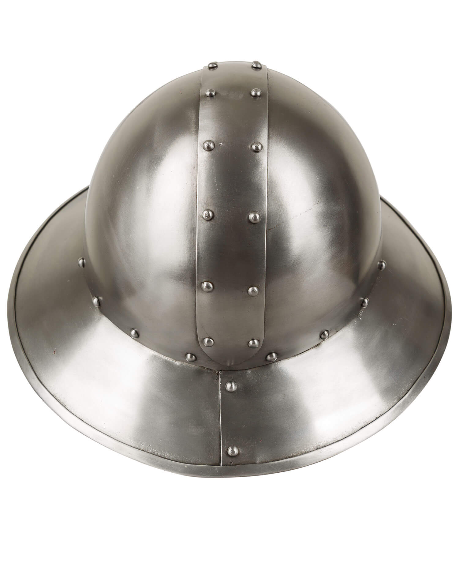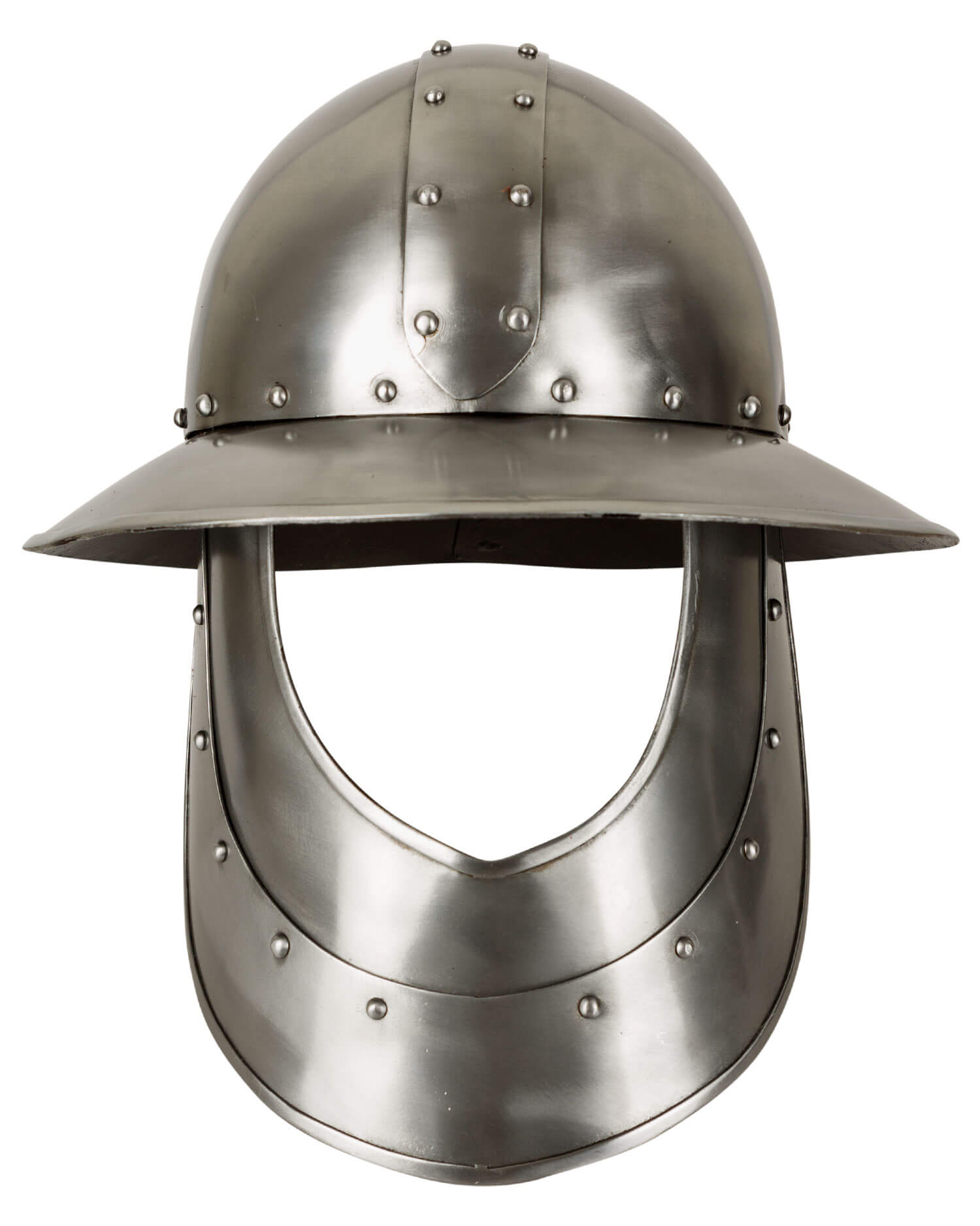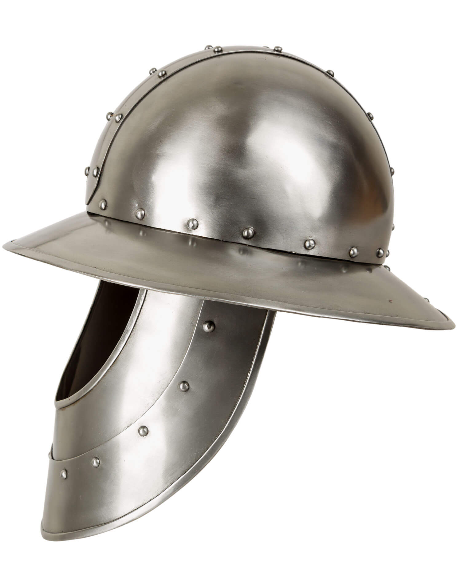 Medieval iron hat made of steel with visor. Padded inside with fabric-covered foam and painted to protect against rust. Can be fastened at the chin with a leather strap and roller buckle.