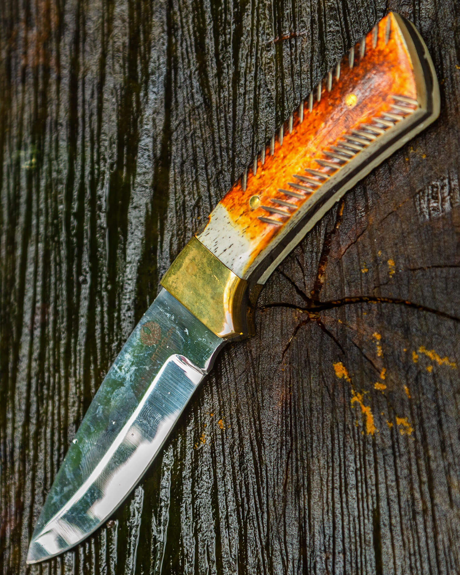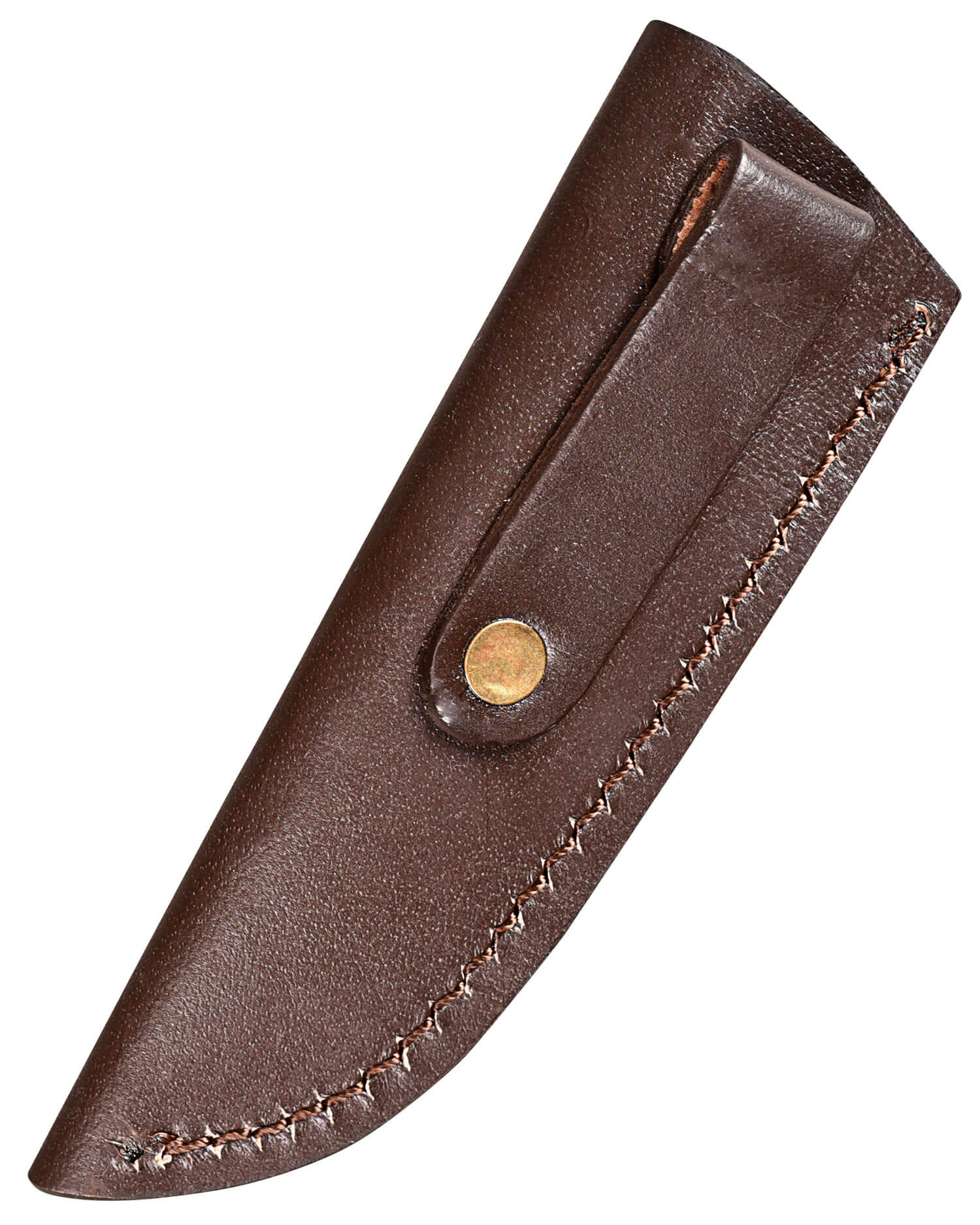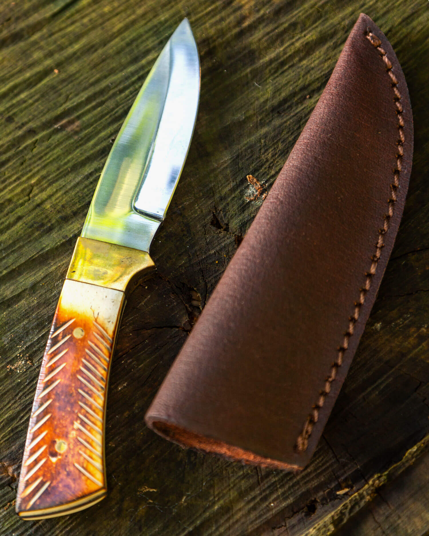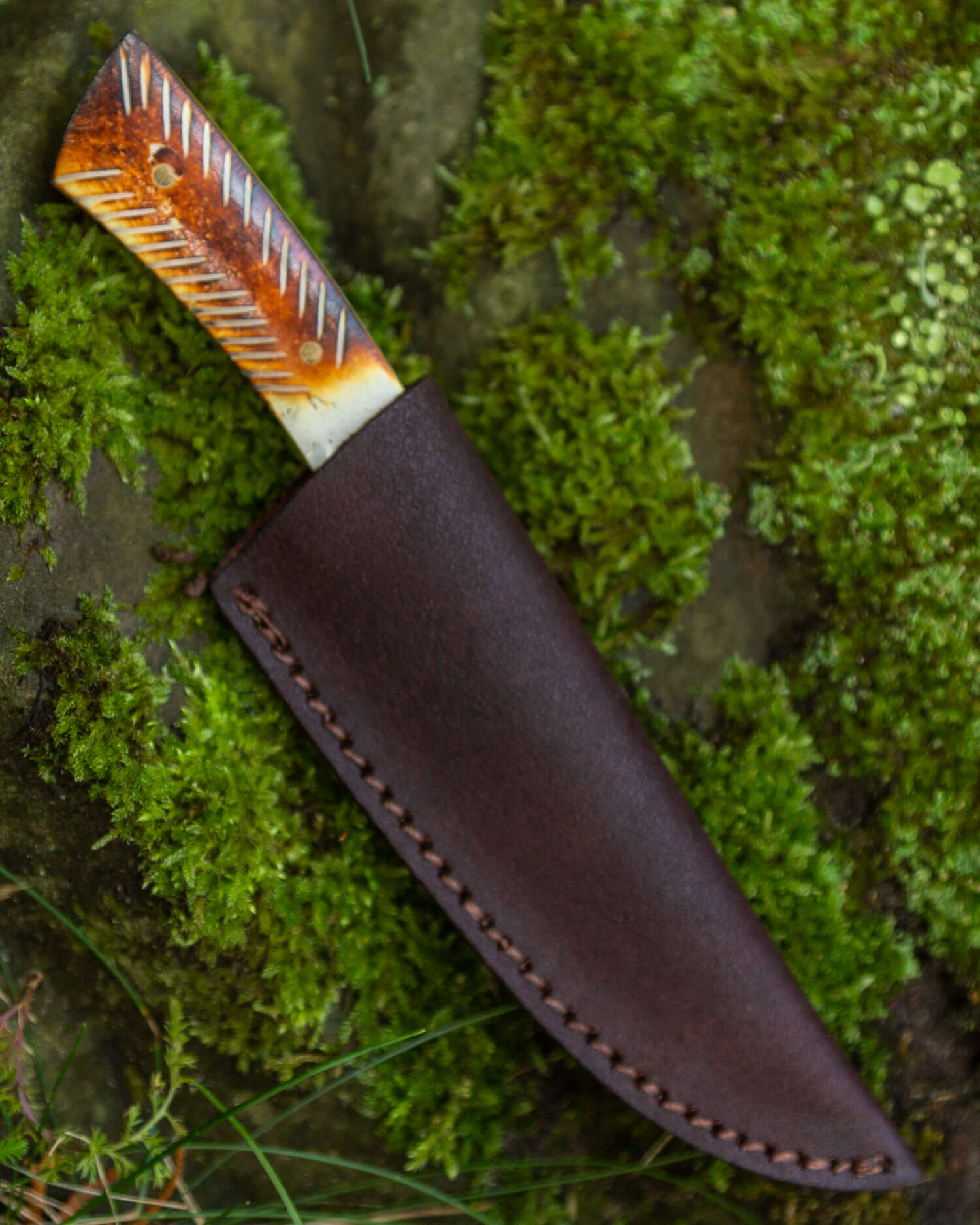 Medieval knife with matching leather sheath for wearing on the belt. The handle is elaborately decorated with brass and engraved camel bones.