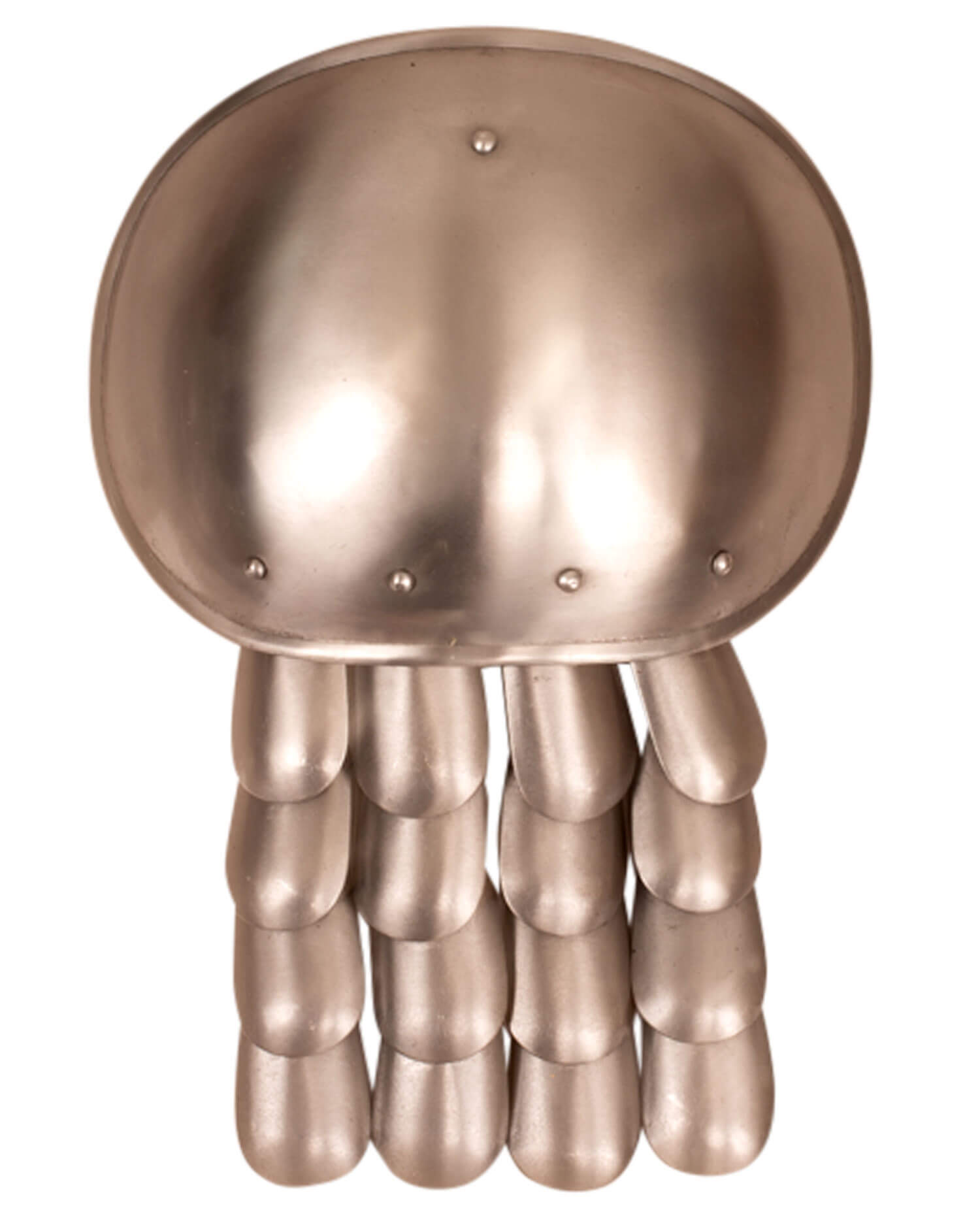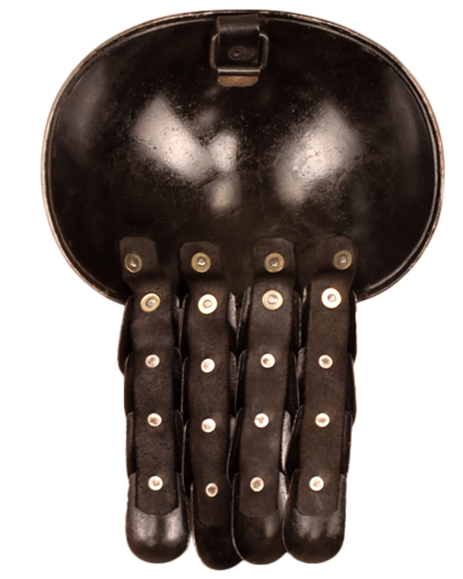 Simple plate shoulders with 16 steel scales. Painted on the inside to protect against rust. Robust D-ring for fastening to collar, gambeson, chain mail etc..
