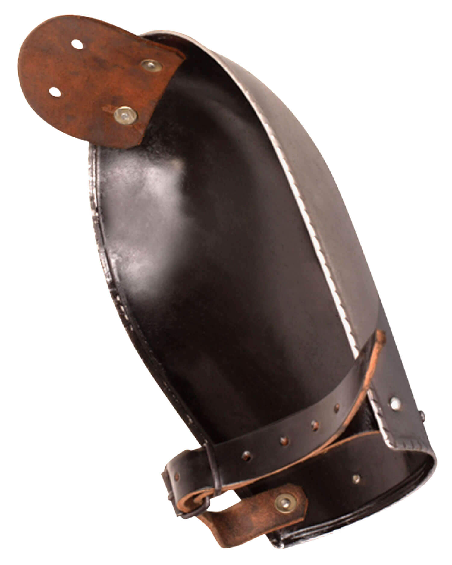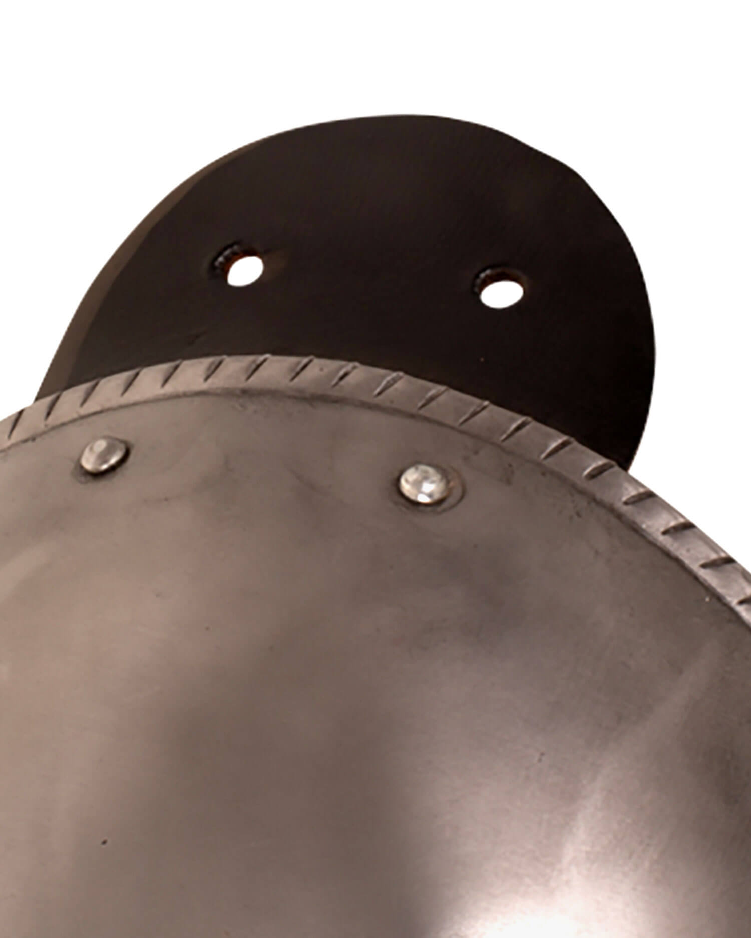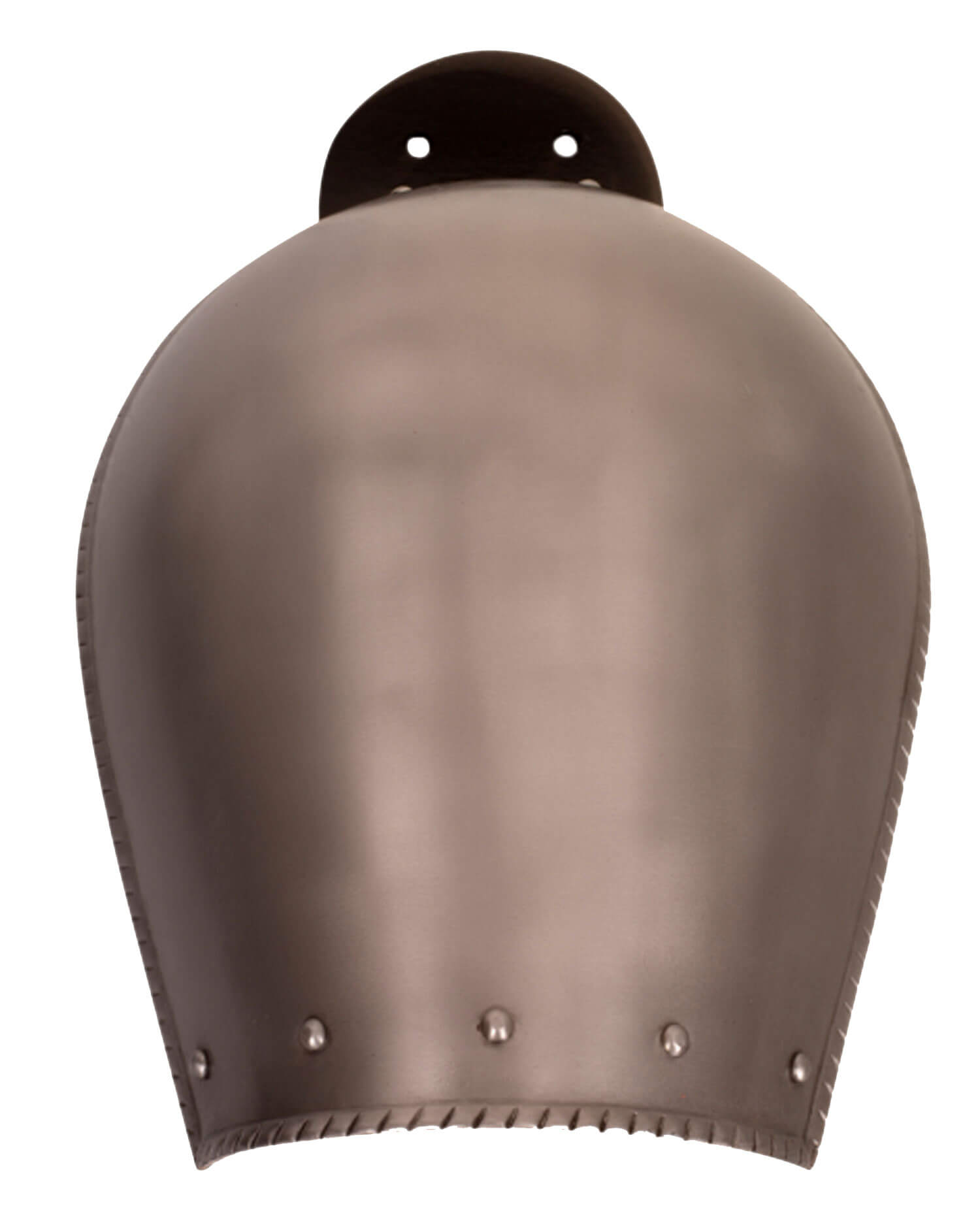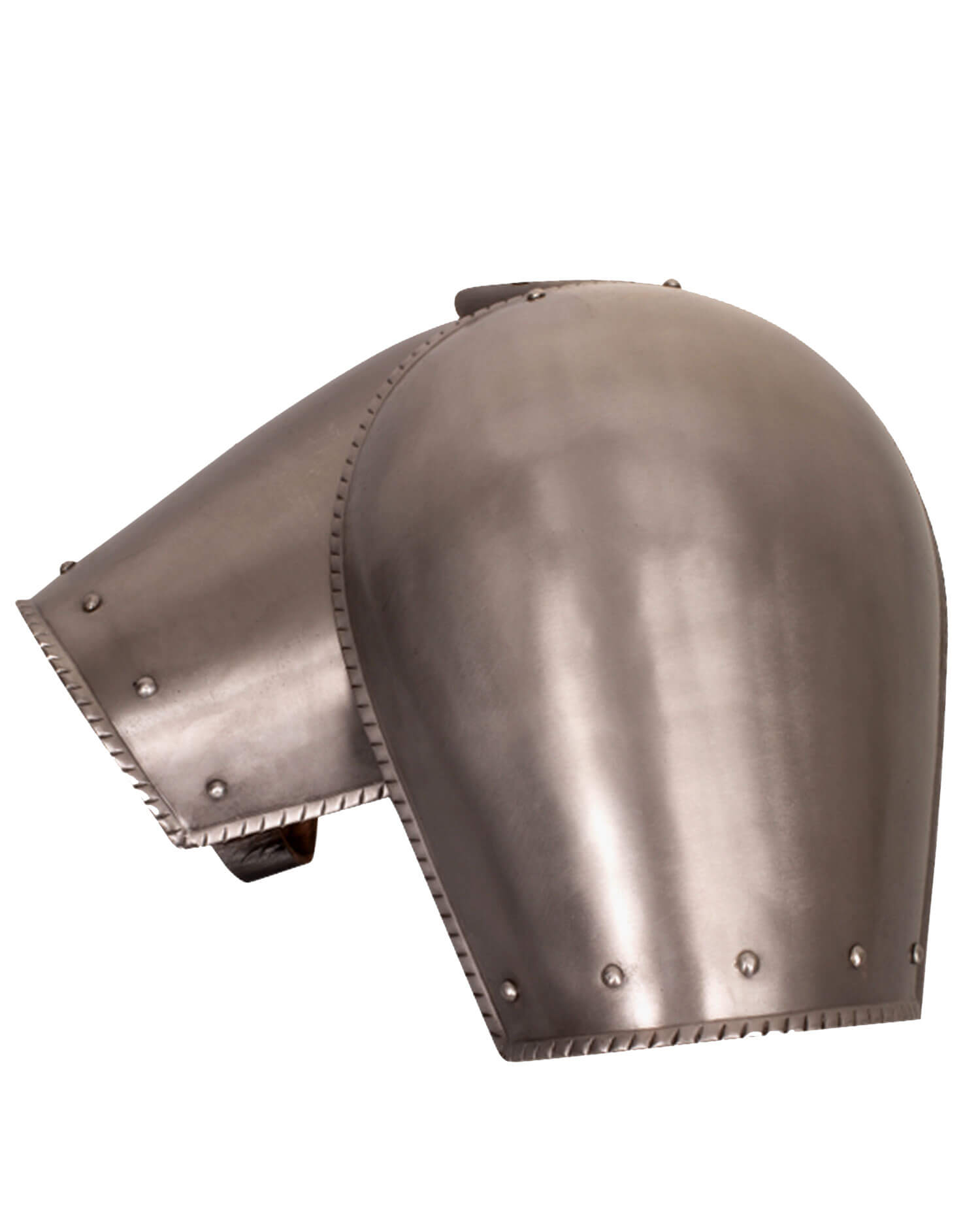 Simple plate spaulders with leather straps for attachment to the arm and circumferential flanging. With robust leather strap for attachment to chain mail, gambeson, plate collar or similar.
