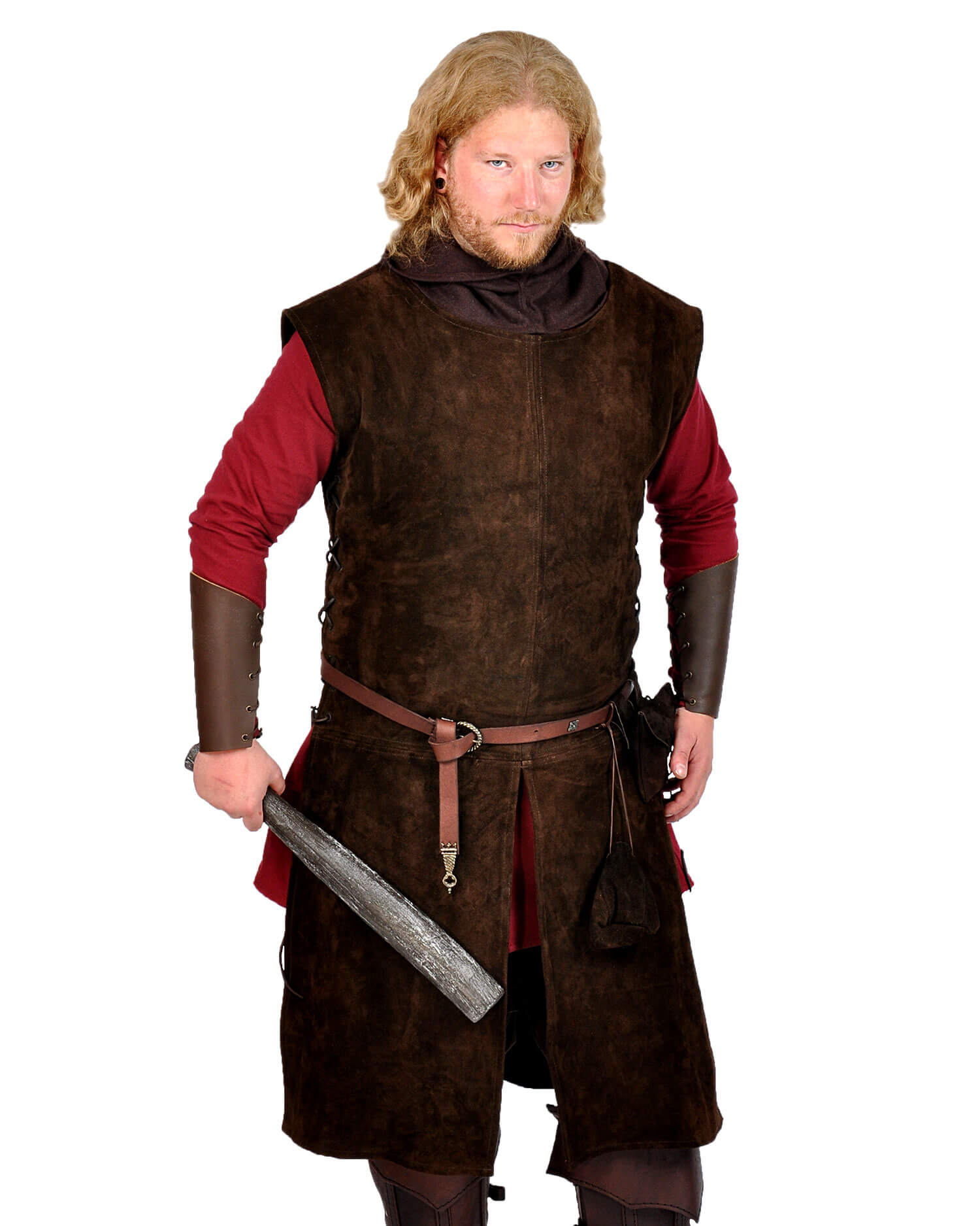 Medieval tunic made from fine suede. Slit at the front and back for greater mobility. Closed at the sides with lacing.
